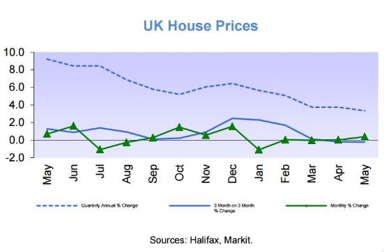 After peaking in March 2016, annual house price growth in the UK has fallen to 3.3% in May 2017, according to the latest Halifax House Price Index. A 0.4% monthly increase in the price of houses between April and May contrasted with a 0.2% quarterly decrease. With prices remaining virtually unchanged over the past three months, the report suggests that the underlying trend for housing prices remains down (albeit at a moderate level).