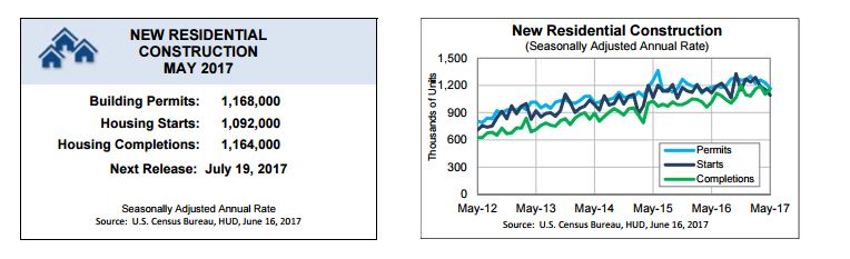 The latest Monthly New Residential Construction Report from the U.S. Census Bureau brings some negative news for the U.S. housing sector. Housing starts hit an eight month low in May 2017, falling 5.5 percent, to a rate of 1.092 million.