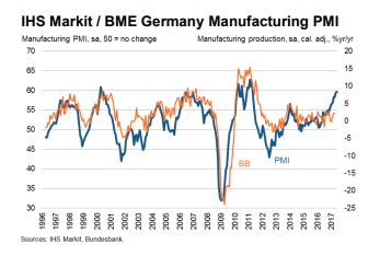 According to June PMI data from BME and IHS Markit, the German manufacturing sector is continuing to grow at the strongest rate in over six years. The PMI rose to 59.6 up from 59.5 in May, reaching a 74 month high.