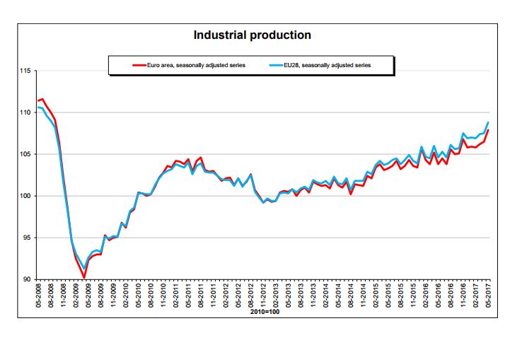 According to the latest report from Eurostat, the industrial sector in the euro area gained momentum in May with production increasing by 1.3% from the previous month. This reading marked the third increase in three months, the best performance since November 2016.