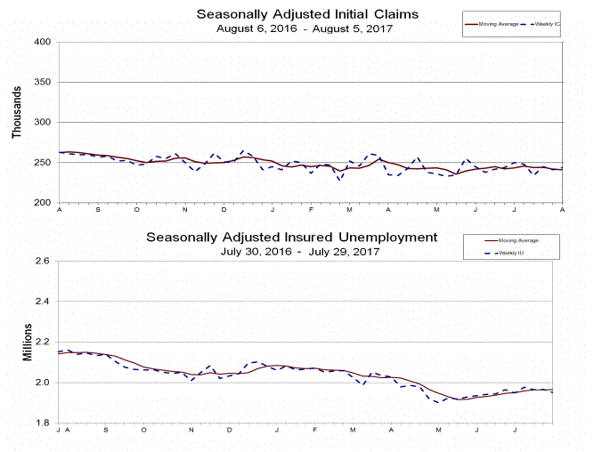 Continuing claims for the week ending in July 29 fell by 16,000 to 1.951 million, leaving both  the 4 week average and the unemployment rate for insured workers unchanged at 1.965 million and 1.4 percent respectively.